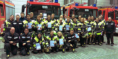 | Der erste Teil der Ausbildung zum Truppmann (Sammelbezeichnung) liegt nun hinter den 21 Teilnehmerinnen und Teilnehmern. Und alle sind glücklich, nun in den Einsatzdienst starten zu können!
